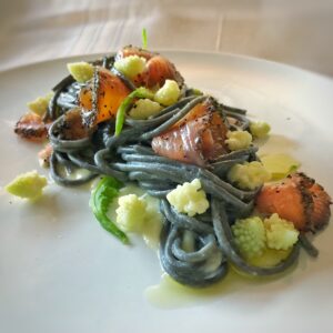 Spaghetti Verrigni al nero di seppia trota marinata e broccolo romanesco